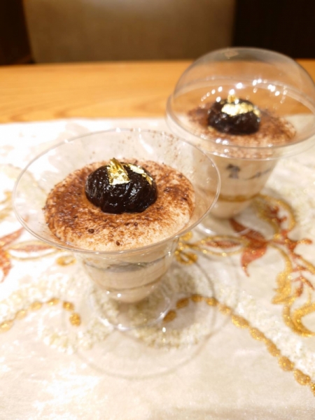 この自家製マロングラッセを中に入れ、アヴェリーノ産の栗のコンポート、フランス産の栗のペーストを使用したリッチで大人な「栗のティラミス」に仕上げております。